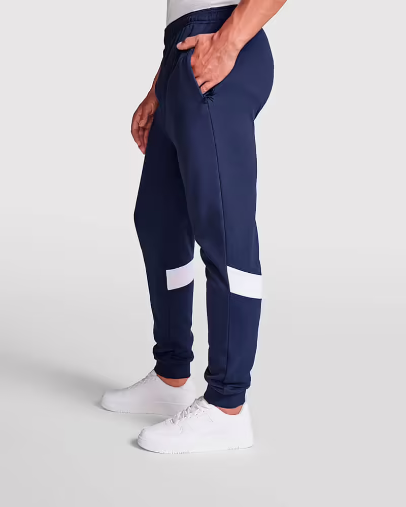 Pantalón largo de deporte con cinturilla elástica y cordón ajustable. Bolsillos laterales con cremallera. Bandas a contraste Blanco. Bajos con puño rib 1×1. Combinable con chaqueta LEROS.