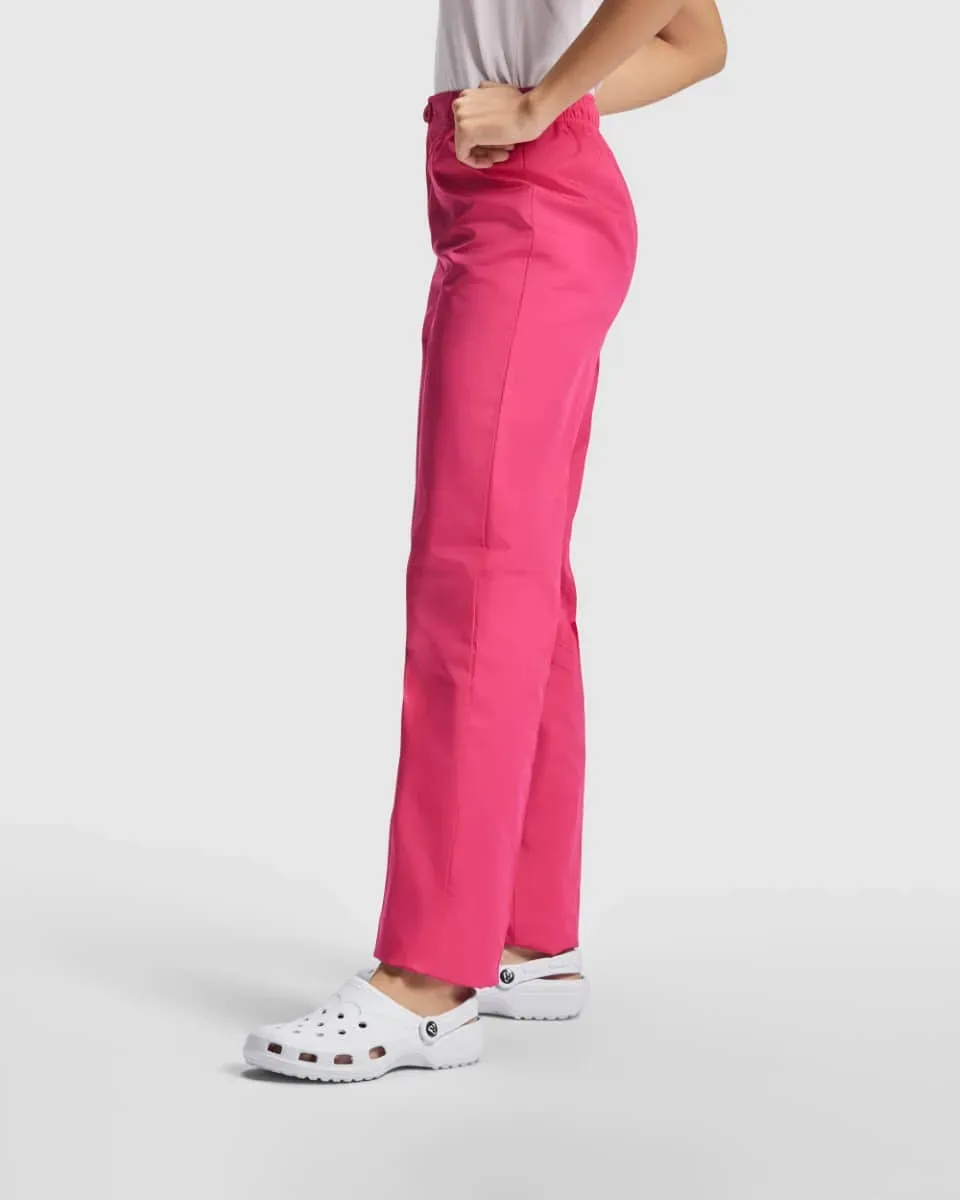 Se trata de un pantalón de colores vibrantes de servicios unisex, de corte recto con cinturilla elástica, cierre de cremallera y botón y bolsillo trasero.