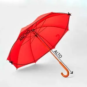 Paraguas con mango, bastón y terminaciones en madera. Varillas en negro. Cierre con velcro en color a juego con la tela del paraguas. Apertura manual.