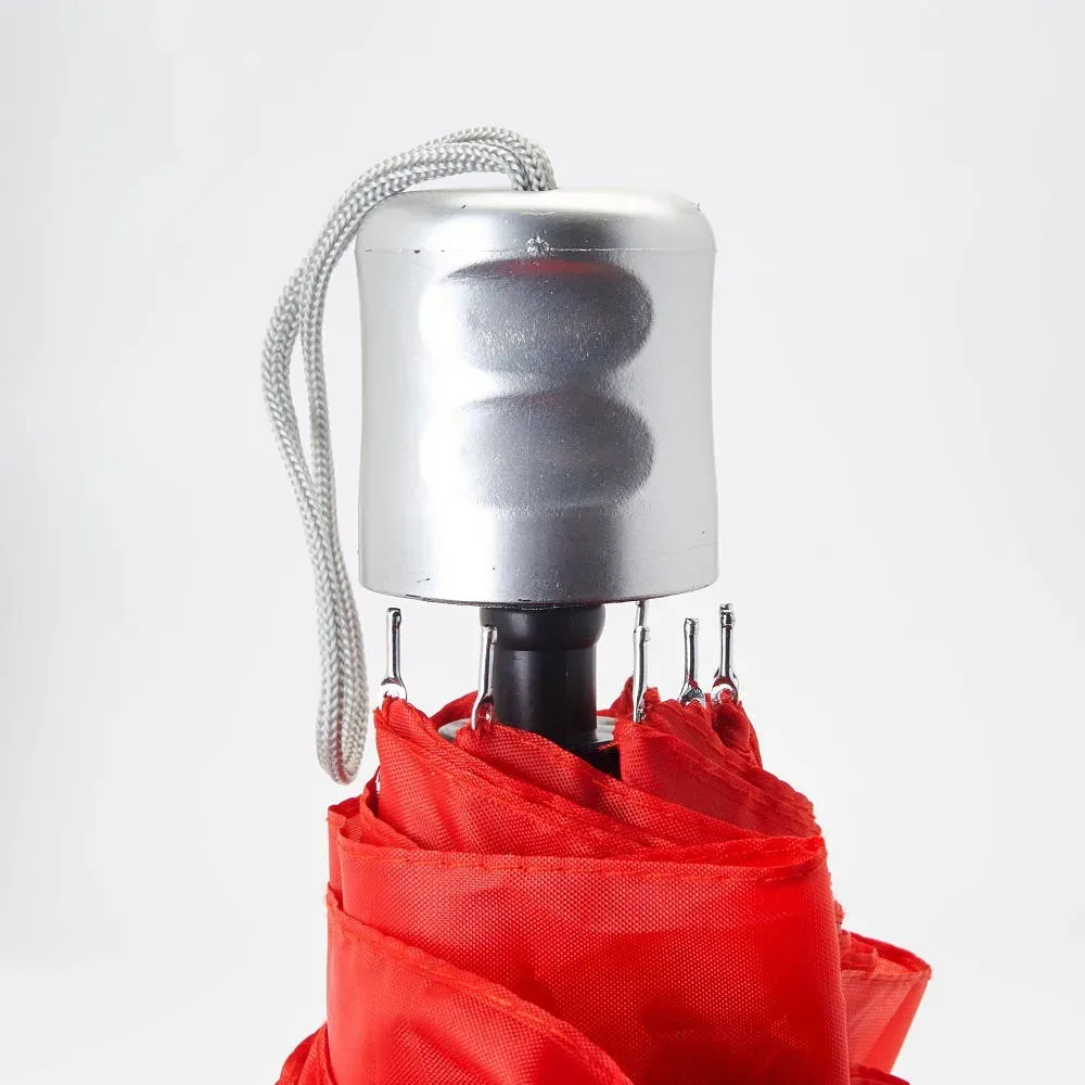 Paraguas plegable con funda a juego. Mango, varillas y contera plateados. Cierre con velcro y apertura manual.