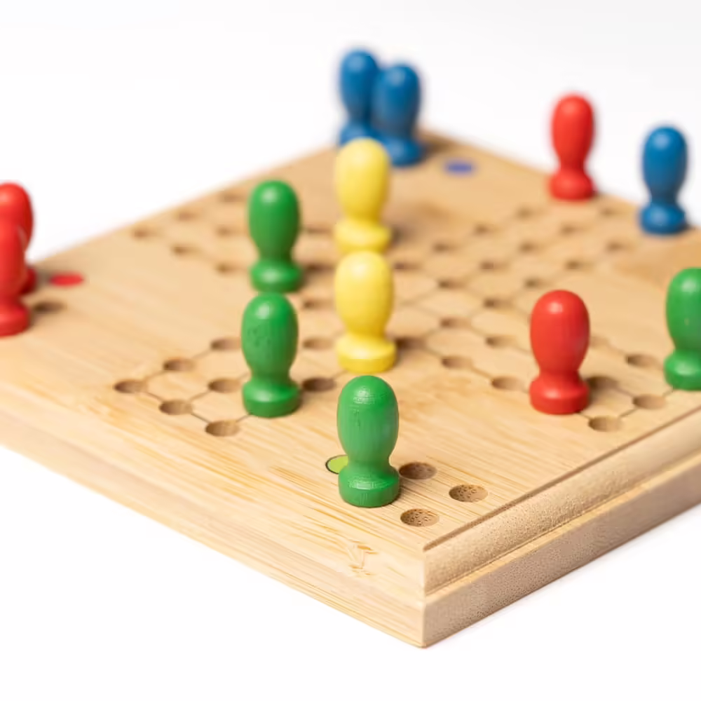 Juego de parchís realizado en bambú. Incluye tablero, un dado y 16 fichas de 4 colores. Incluye funda de algodón.