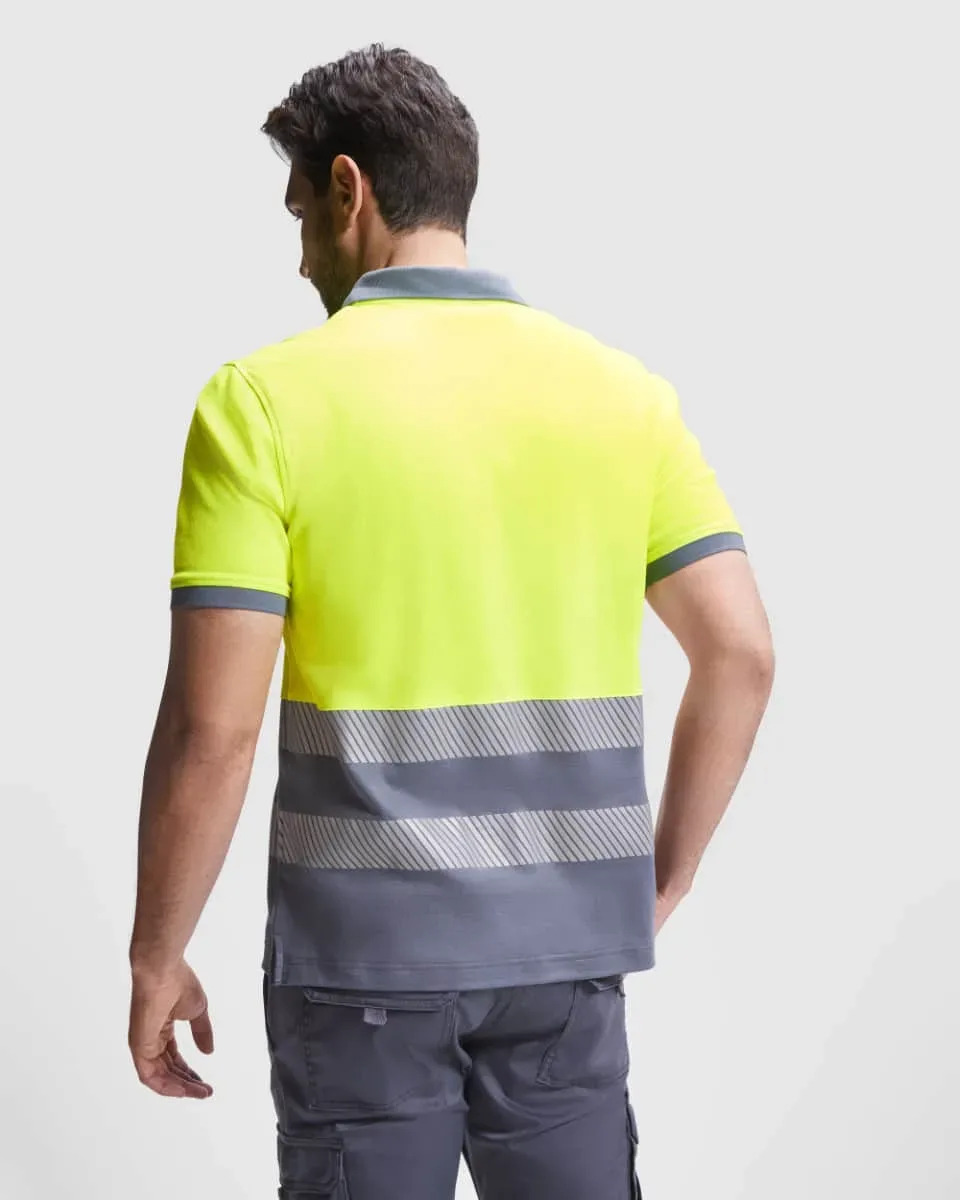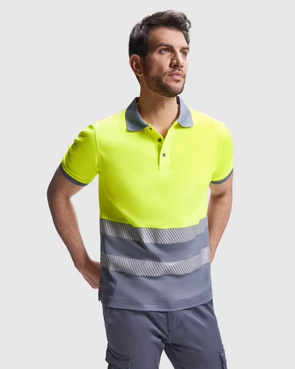Este polo técnico de manga corta tiene dos bandas reflectantes en la zona del torso. El cuello es en punto canalé 1 x 1, además de tener una tapeta con 3 botones a contraste. Cuenta con un tejido mezcla en 55% algodón y 45% poliéster para una mayor comodidad y transpirabilidad ¿Qué más puedes pedir?