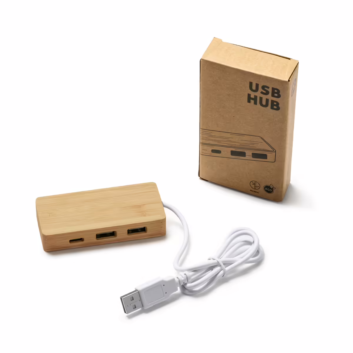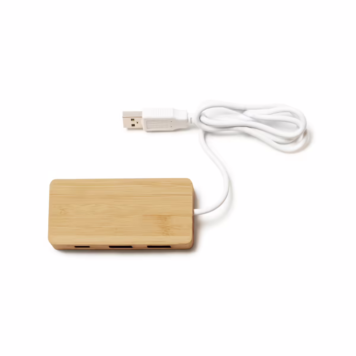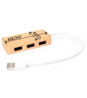 Puerto USB con cuerpo de bambú natural y cable en blanco. Incluye 3 puertos USB. Presentación en caja de diseño eco.