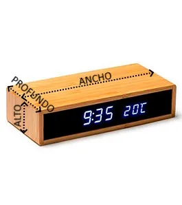 Reloj con cargador inalámbrico. Tiene una potencia de 5W. Realizado con bambú, y tiene diversas funciones: hora, fecha, alarma y temperatura. Conexión Tipo C. Cable incluido.