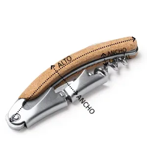 PRODUCTO QUE SE DESCATALOGARÁ CUANDO SE AGOTEN LAS EXISTENCIAS – Sacacorchos de acero inoxidable estilo clásico con mango en corcho. Este diseño ofrece durabilidad y resistencia, asegurando, gracias a su mango de corcho, un agarre cómodo y seguro. Cuenta con mecanismo de doble palanca facilita el proceso de apertura, minimizando el esfuerzo.