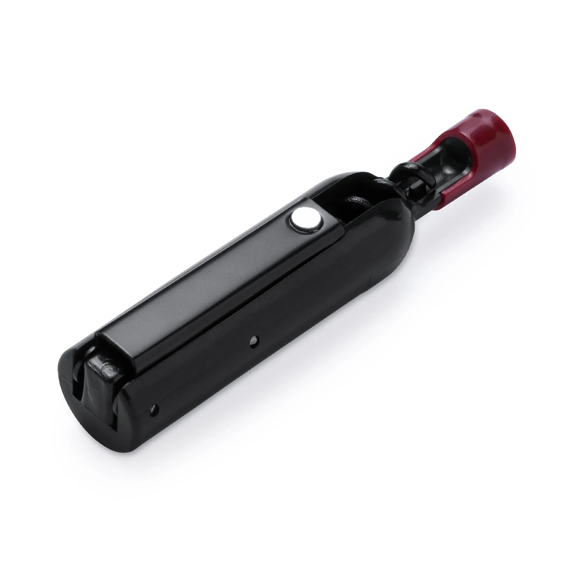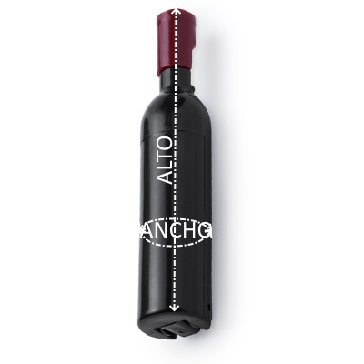 Sacacorchos metálico con original diseño en forma de botella en plástico.