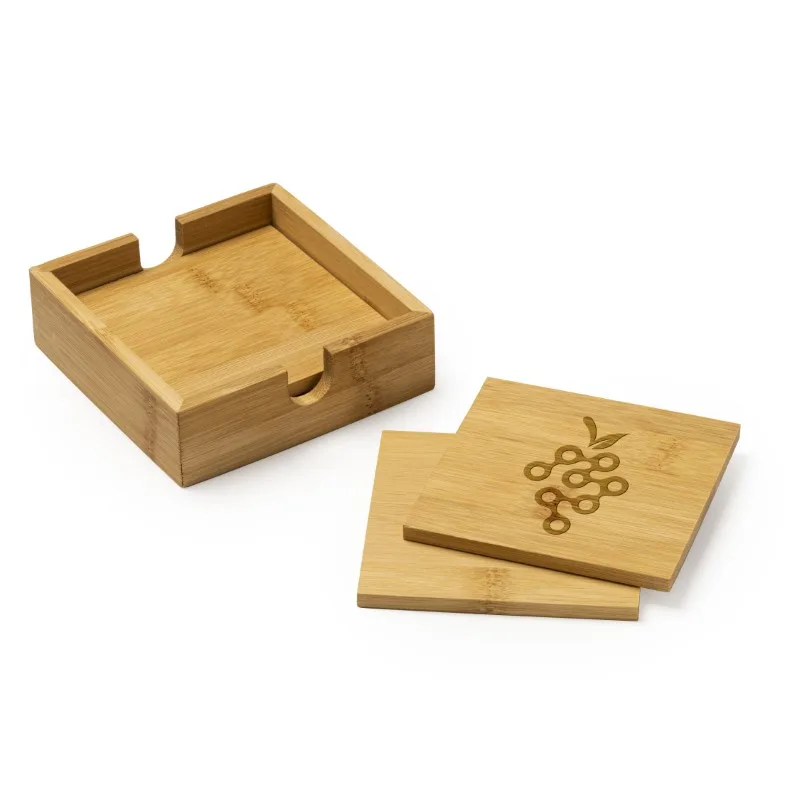Set de 4 posavasos de bambú natural guardados en una elegante caja de bambú. Fantástico para el uso diario.
