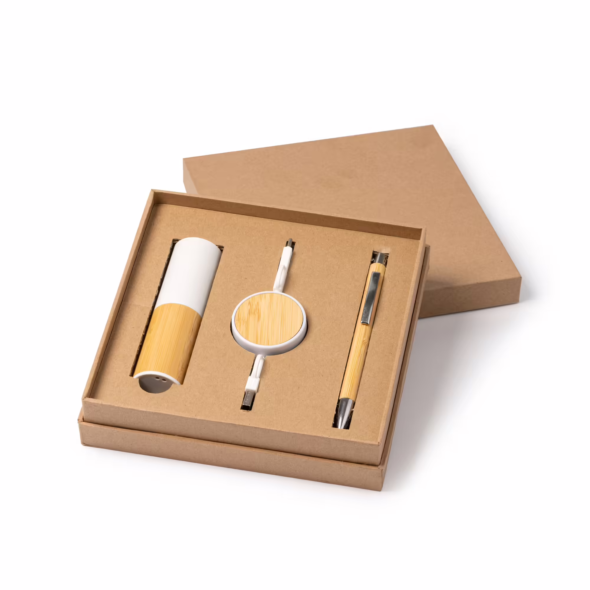 Set de regalo compuesto por batería externa, cable cargador extensible y bolígrafo. Batería realizada en bambú y ABS reciclado, de 4.500mAh, con entrada USB y salida Tipo C, con indicador luminoso. Cable extensible en bambú y ABS reciclado con adaptador Tipo C y USB. Bolígrafo elaborado en bambú, de tinta azul. Presentación en caja diseño eco.