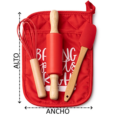 Set de cocina compuesto por 3 piezas para elaborar galletas en casa. Incluye rodillo, varilla y espátula con diseño navideño. Incluye guante multiusos donde se introducen los elementos del set para su guardado.