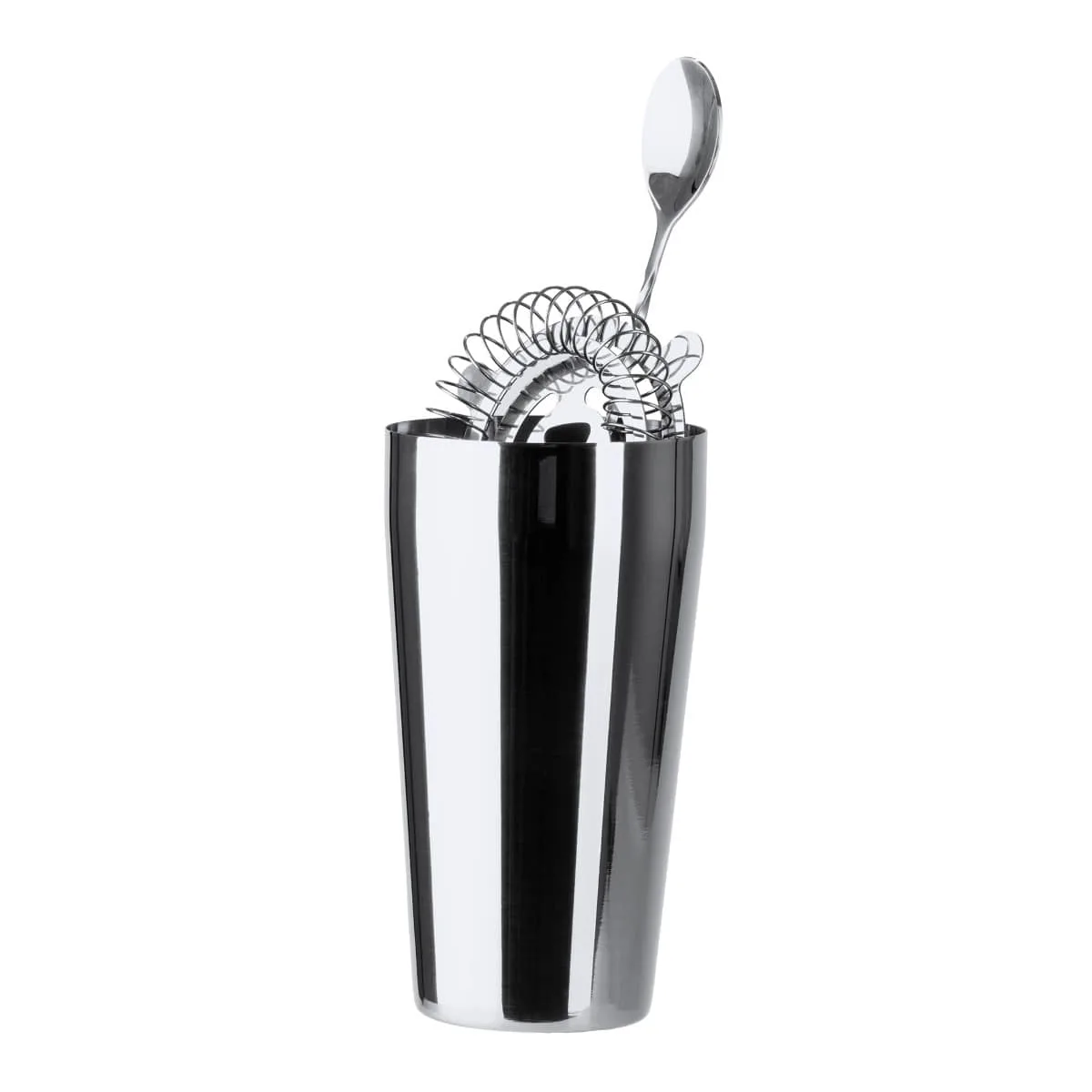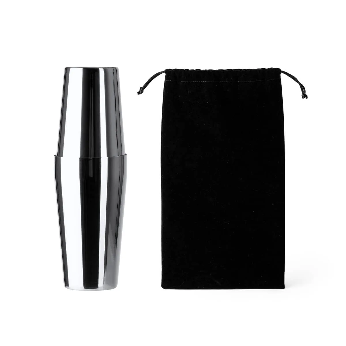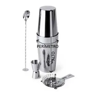 Set de cóctel en acero inoxidable 304. Incluye vaso medidor, coctelera de 580 ml, colador y cuchara. Bolsa de transporte incluida.