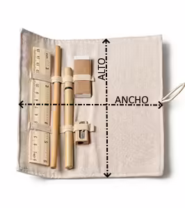 Set de escritura con regla realizada en bambú, lápiz de papel, bolígrafo de cartón, sacapuntas de madera y goma de borrar. Presentado en estuche de yute y algodón.