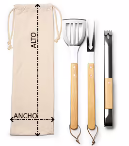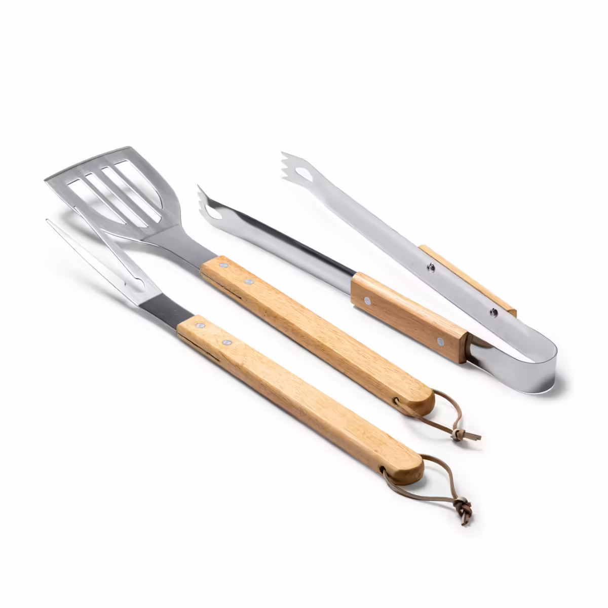 Set para barbacoa con 3 accesorios elaborados en acero inoxidable con mango de madera: trinchador, pinza y espátula. El acero inoxidable le confiere resistencia ante el calor y el mango de madera hace más cómodo su agarre.