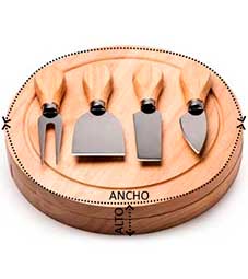 Set de quesos con 4 utensilios de acero inoxidable y mango de madera. Presentación en práctico estuche de madera con tabla para cortar en la zona superior.