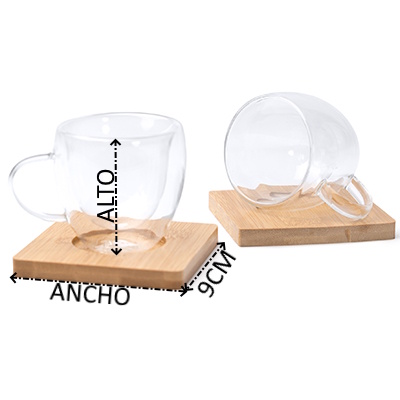 Set de café compuesto por 2 tazas de cristal de doble pared con un posavasos invididual cuadrado elaborados en bambú para cada una. Cada taza aísla el calor gracias a su doble pared, haciendo más cómodo su uso. Cada taza cuenta con una capacidad de 90 ml.