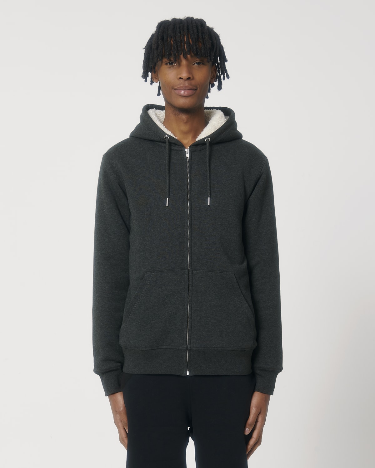LA SUDADERA UNISEX CON CREMALLERA FORRADA CON BORREGUILLO Manga pegada Capucha forrada de borreguillo reciclado Cordón redondo en el mismo tono rematado con extremos de acabado metálico Ojales de metal Bies interior greige de espiga en el cuello Media luna del tejido principal en la zona trasera del cuello Cremallera central delantera metálica cubierta Canalé 1×1 en puños y bajo Sisas, puños y bajo con pespunte doble Bolsillo canguro en la parte delantera Totalmente forrada con borreguillo reciclado Bolsillo interior en el pecho Cremallera interior invisible en el bajo para ajustar a medida