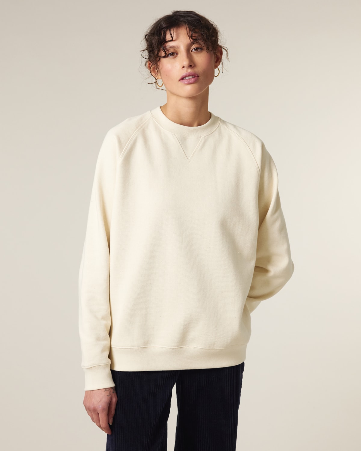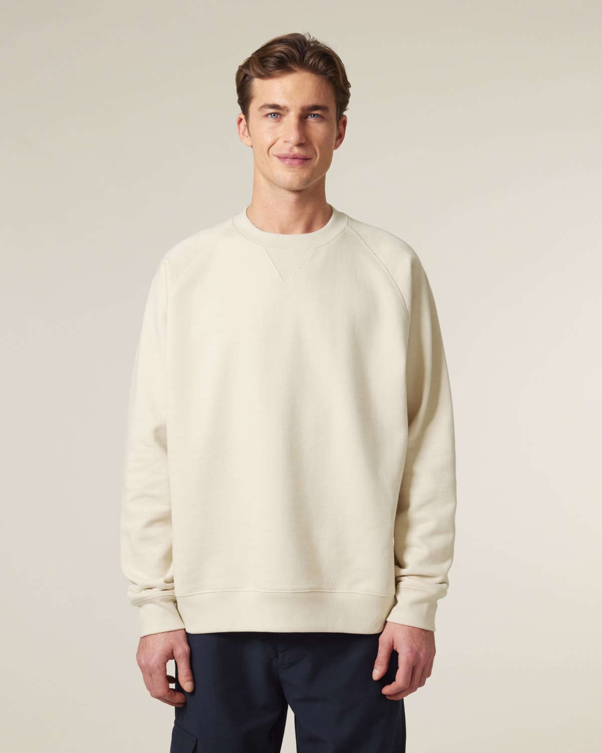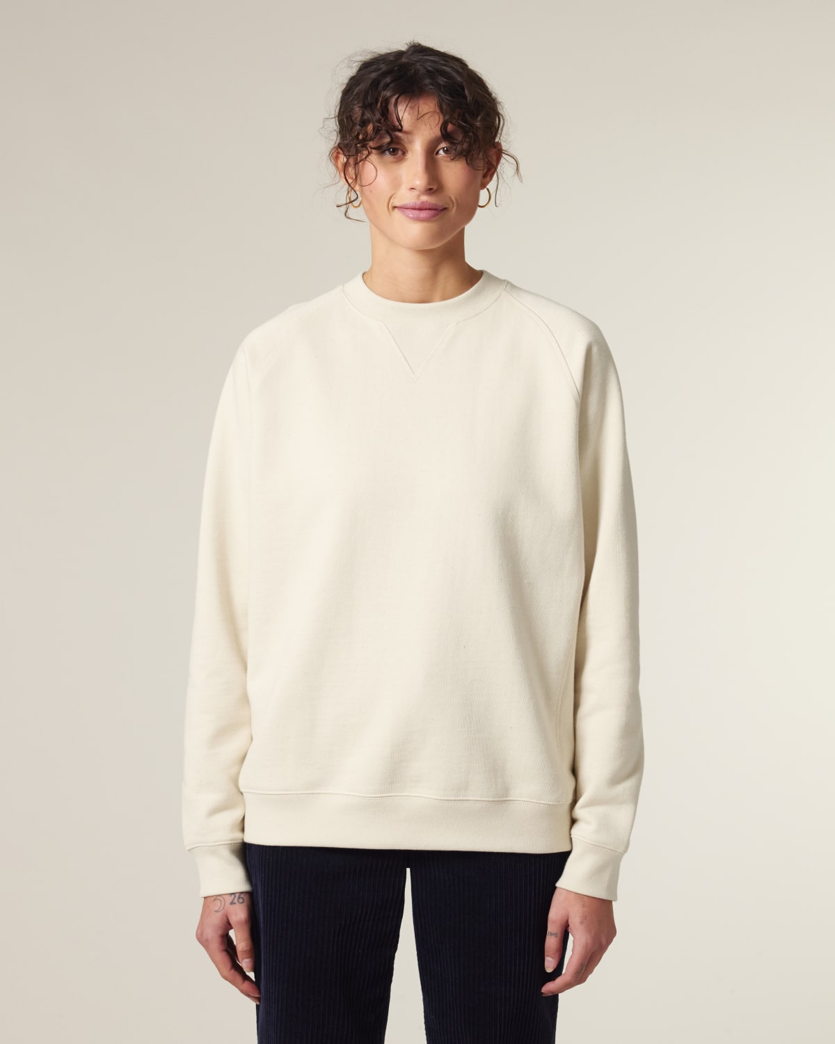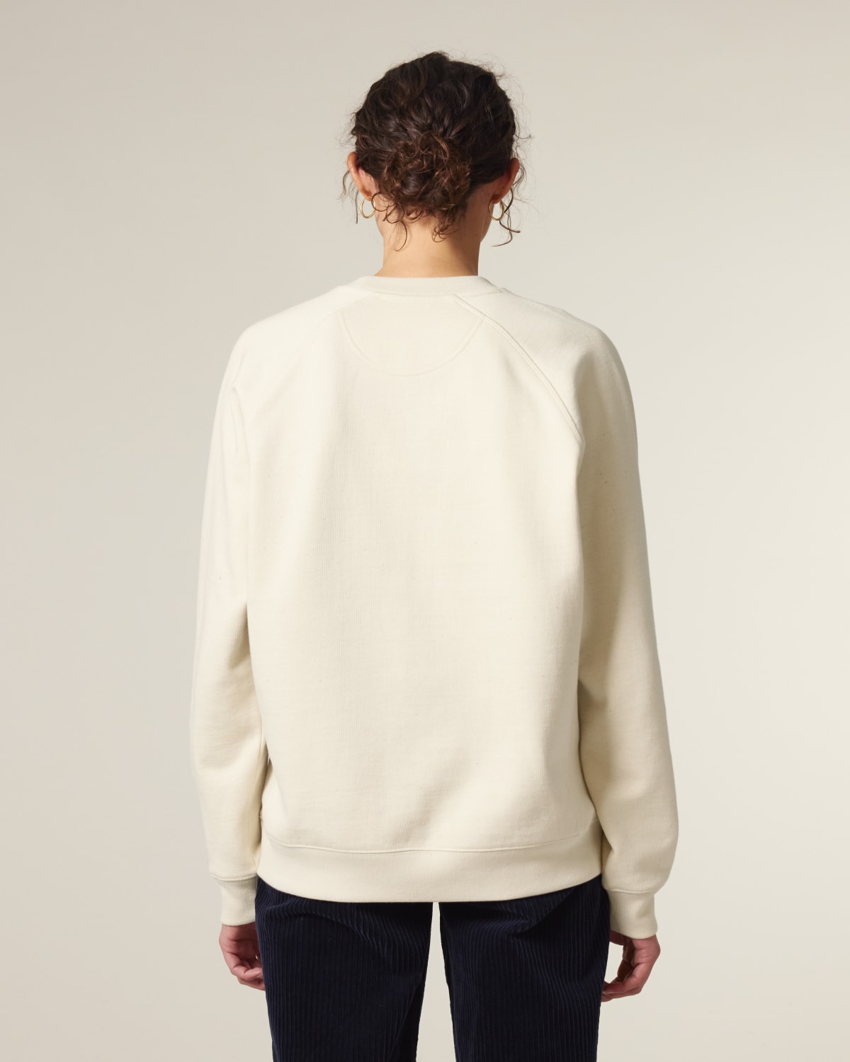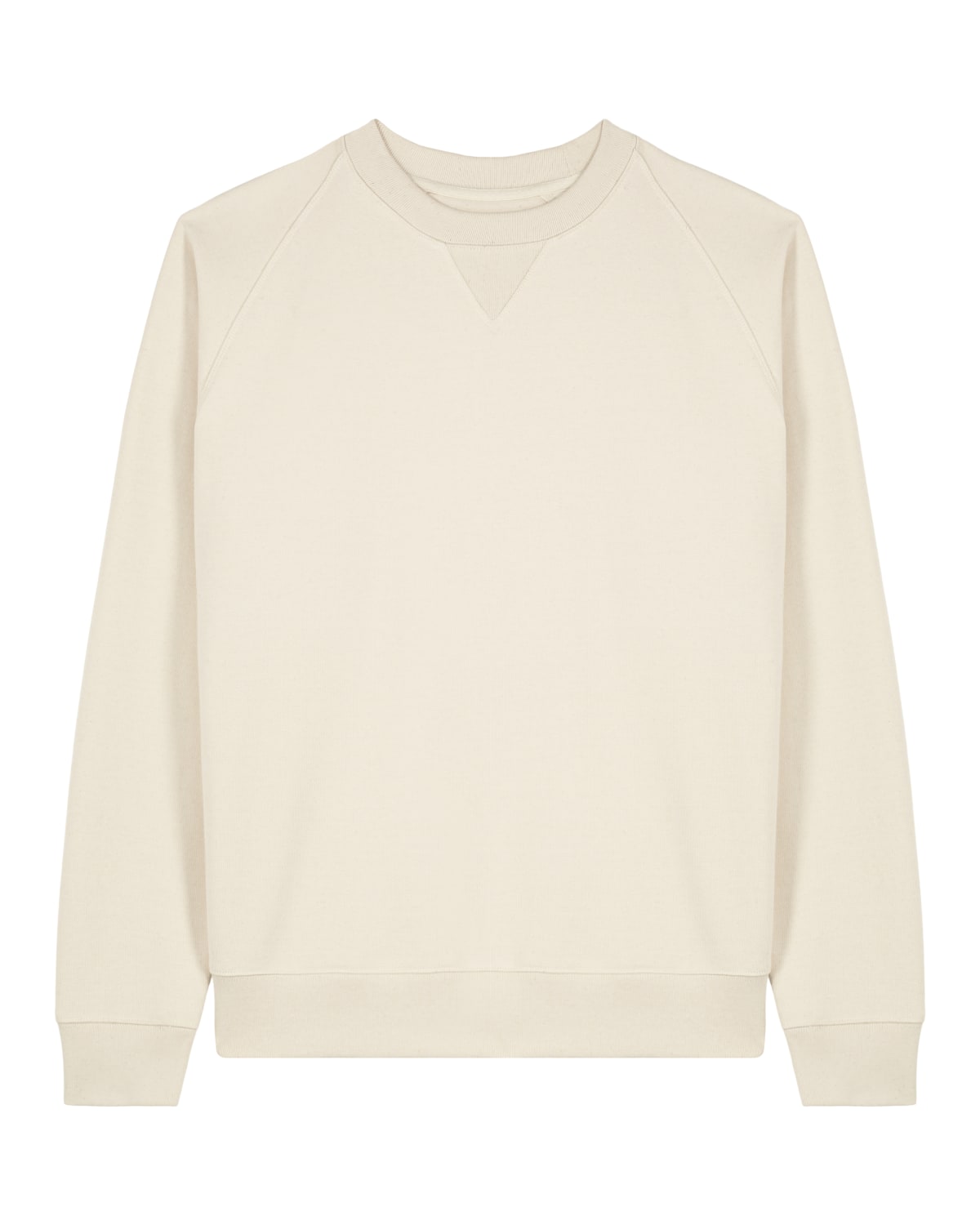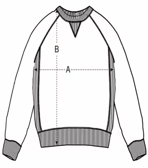 Mangas raglán Costillas 1×1 en cuello, puños de las mangas y dobladillo inferior Costillas 1X1 con muesca en V en el cuello Paneles laterales de costillas 1×1 Costura superior de doble aguja en cuello, puños de las mangas y dobladillo inferior Costura plana de tres agujas en la costura raglán, costuras de los paneles laterales y muesca en V Cinta interior del cuello en espiga Media luna de la misma tela en la nuca