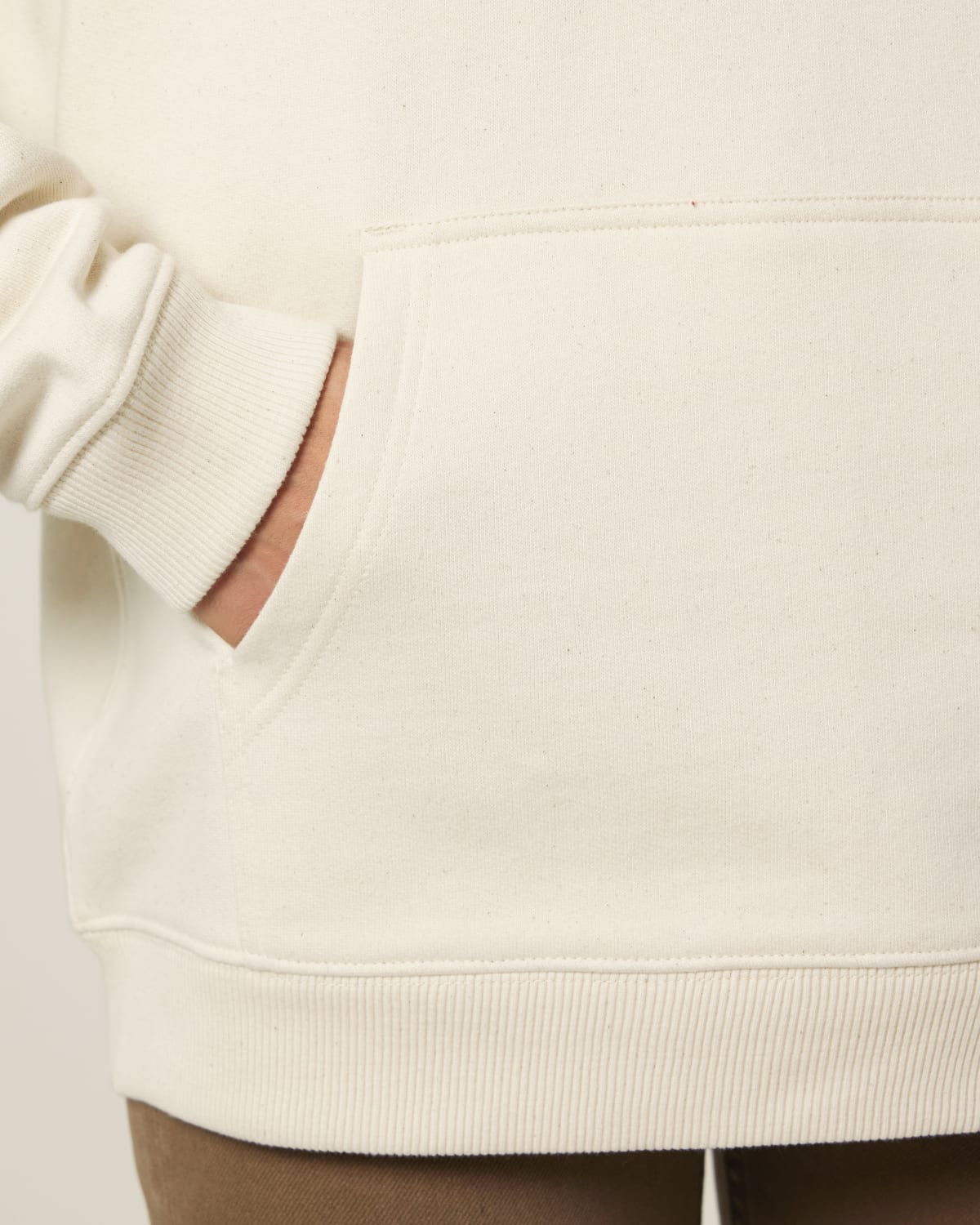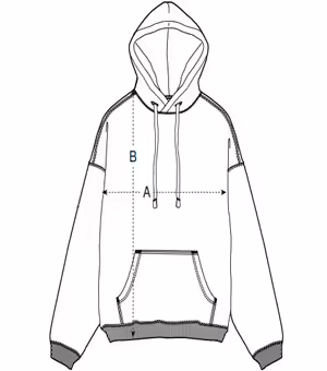 Manga montada Capucha doble capa en la misma tela Cordones planos en color a juego con el cuerpo Ojales bordados Doble costura en todas las costuras Costillas 2×1 en los puños de las mangas y dobladillo inferior Bolsillo tipo canguro en el frente Cinta de espiga en la parte interior del cuello Media luna de la misma tela en la nuca