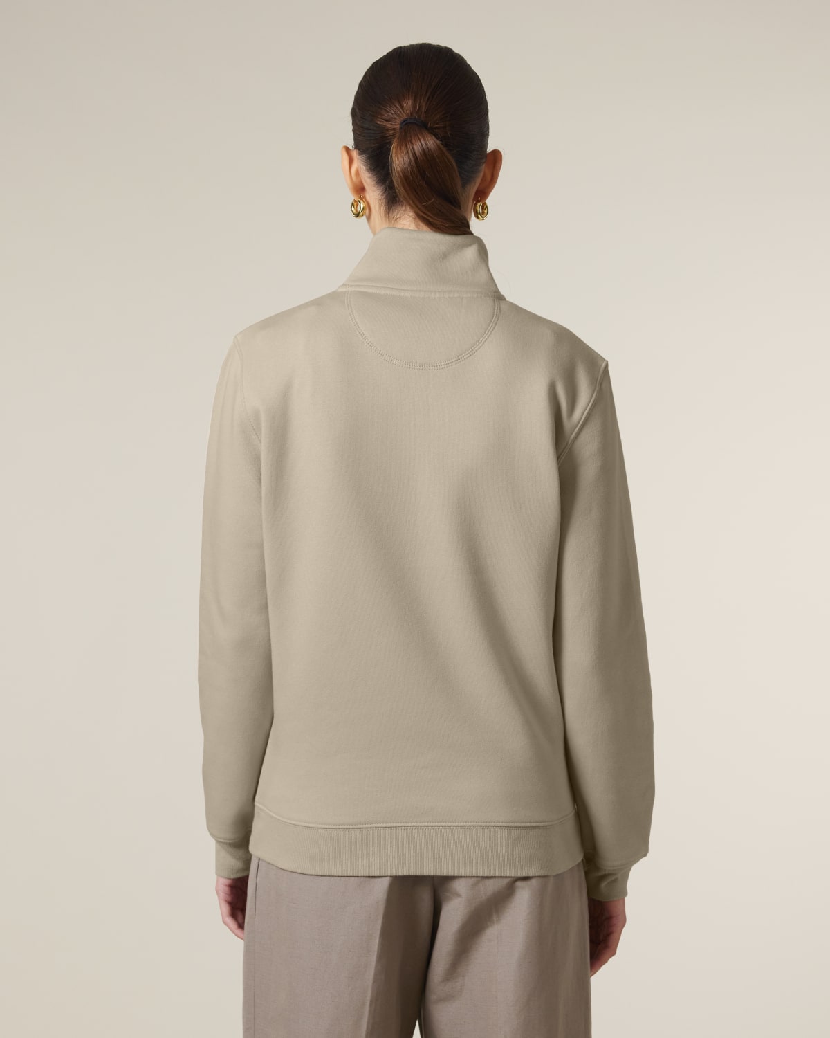 Mangas montadas Cuello simulado de la misma tela Cremallera de un cuarto en el centro frontal Costilla 1×1 en los puños de las mangas y dobladillo inferior Doble costura en la sisa, puños de las mangas y dobladillo inferior Cinta de espiga en el interior del cuello y en el interior de la cremallera Media luna de la misma tela en la nuca