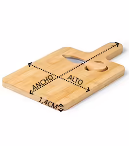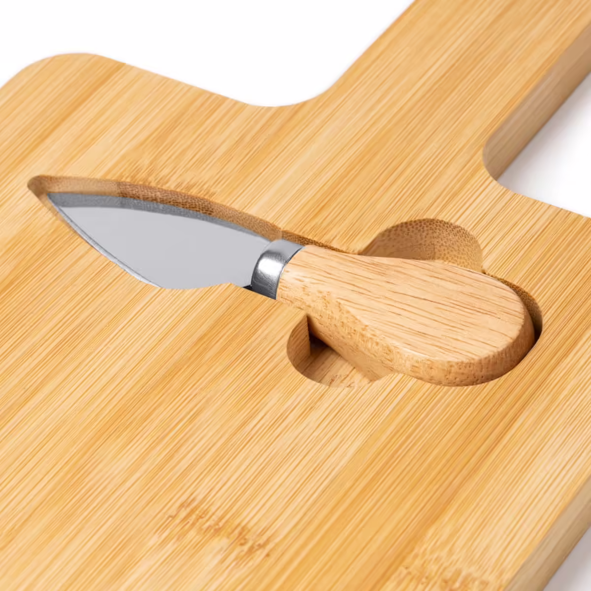 La tabla de cortar de bambú incluye un mango para un manejo cómodo. Incluye un cuchillo de acero inoxidable especial para quesos, ideal para preparar y servir con elegancia.