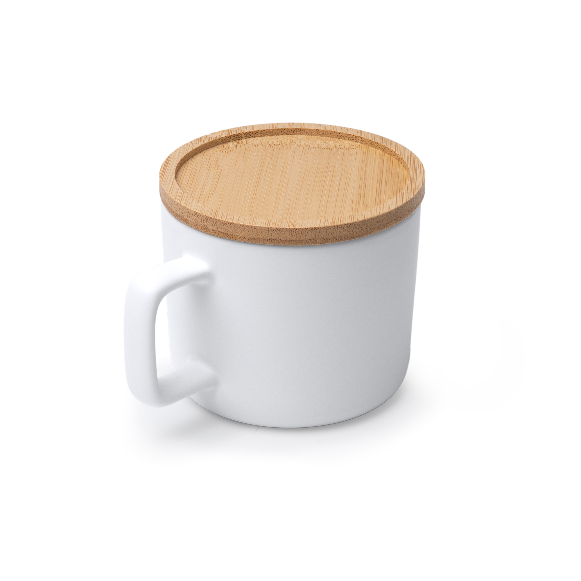 Taza de cerámica con exterior en acabado mate y asa cuadrada. Cuenta con una capacidad de 350 ml y una tapa realizada en bambú con función posavasos, que la dota de mayor versatilidad. Su interior está elaborado con un acabado en brillo para mayor resistencia y durabilidad. Diseño especial para sublimación.
