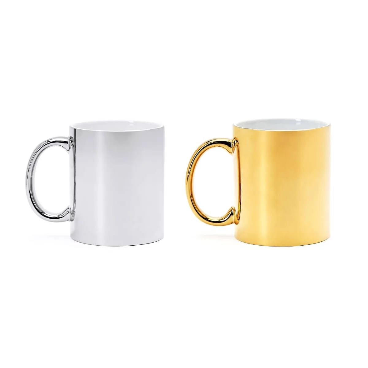 Taza de cerámica de 350 ml con diseño en acabado brillo. Especial para grabado láser. Disponible en plata y oro.