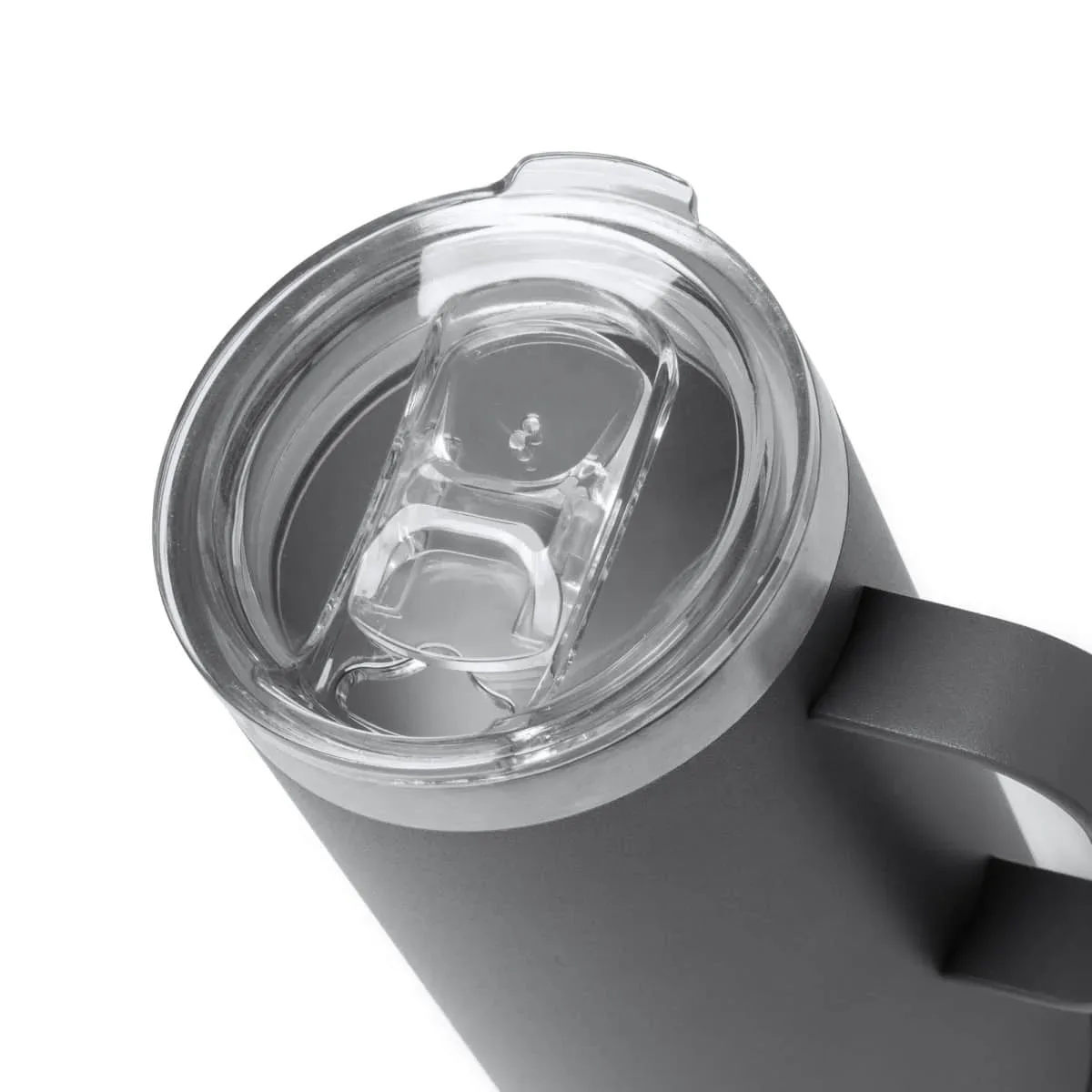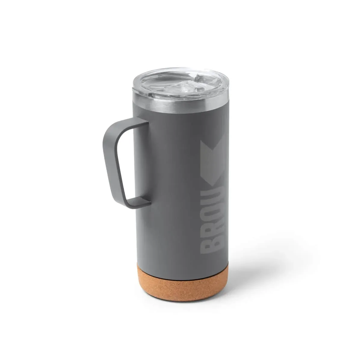 Taza metálica de doble pared con base de corcho y tapa de seguridad transparente. Capacidad de 600 ml.