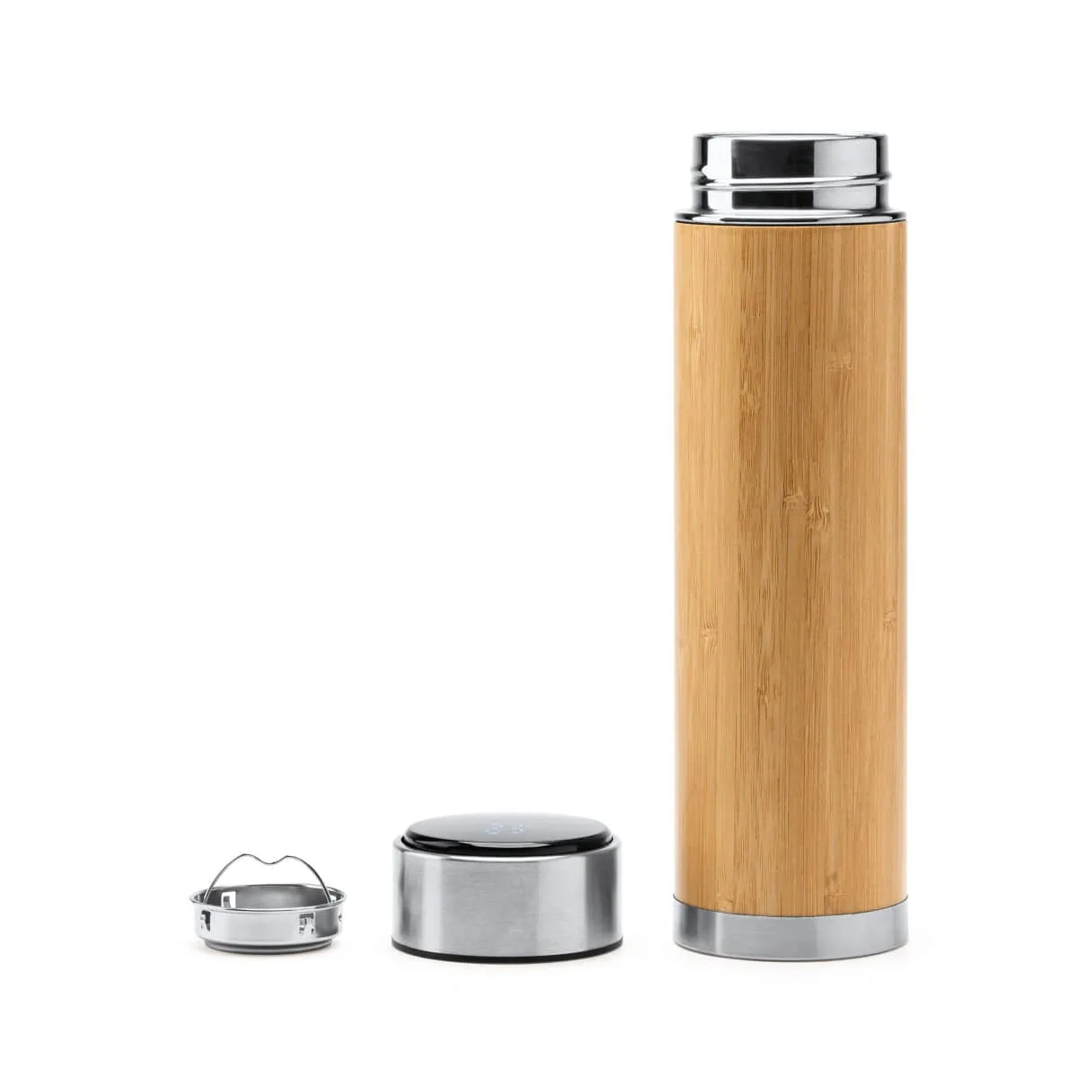 PRODUCTO QUE SE DESCATALOGARÁ CUANDO SE AGOTEN LAS EXISTENCIAS – Termo doble pared de acero inoxidable 304 y bambú natural con infusor. Incluye termómetro digital táctil en la tapa para saber la temperatura de tu bebida, ideal para saber si tu bebida está caliente o fría. Capacidad de 480 ml.