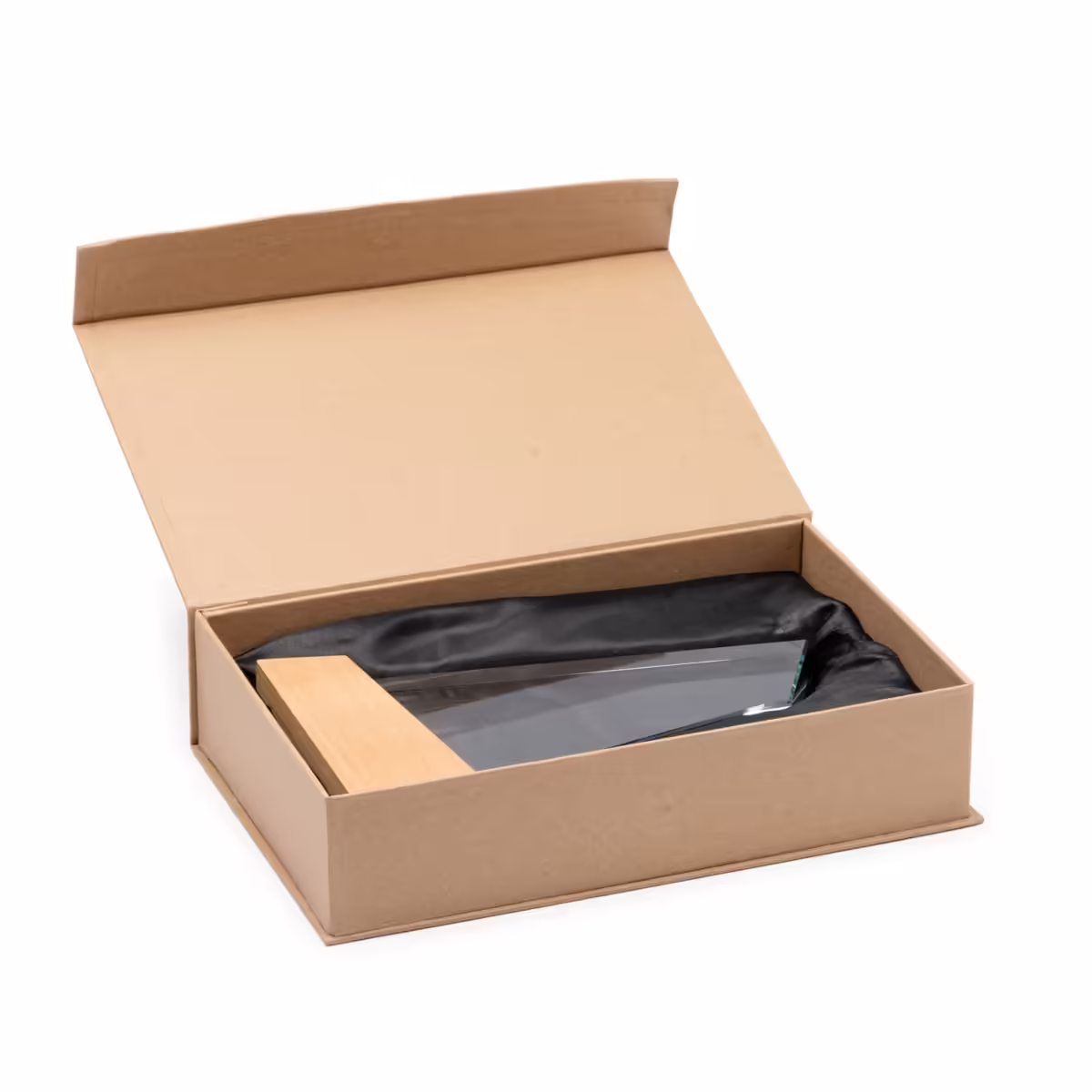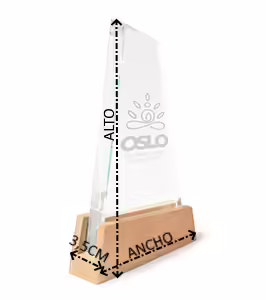 Trofeo de cristal de diseño náutico con base de bambú. Incluye estuche de presentación en diseño kraft.