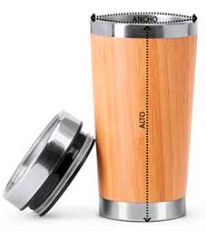 Vaso de acero inoxidable 304 con pared exterior de bambú. Capacidad de 500 ml con tapa dosificador. El vaso perfecto para promocionar tu negocio, sin olvidarte de la naturaleza.