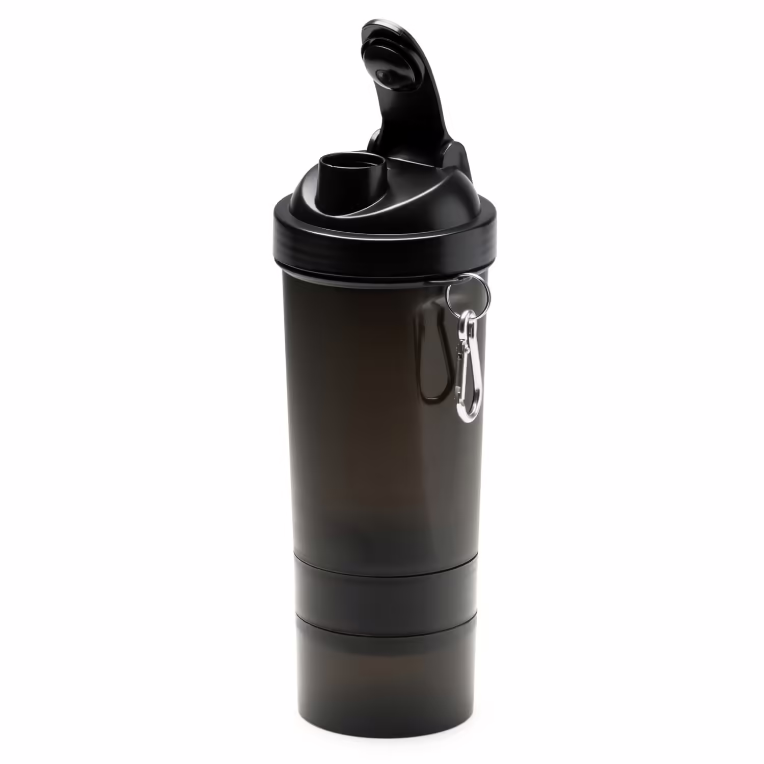 Shaker elaborado en PP, con agitador de acero inoxidable 304. Capacidad de 600ml. Cuenta con compartimentos adicionales para suplementos y dosificador, también elaborados en PP. Además incorpora un mosquetón especial para facilitar su transporte. Una opción práctica y funcional que además cuenta con un tacto suave.