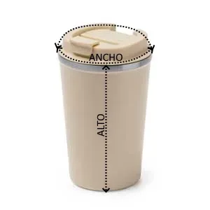 Vaso térmico de acero inoxidable 304 de doble pared. Tapa con rosca antifugas y práctico tapón para beber. Capacidad de 450 ml.